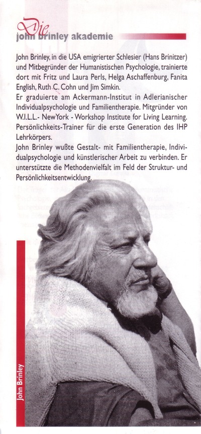 John BRINLEY war für uns neben anderen (bereits genannten) Vertretern der ersten Generation einer Humanistischen Psychologie entscheidender Motivator dafür, in Nordrhein-Westfalen eine neue Form der Weiterbildung zu installieren, die dazu beiträgt, Schrecken der Nazizeit wiedergutmachen zu helfen, dem Destruktiven im Menschen so entgegen zu wirken, dass Derartiges nicht wieder passiert, und das internationale Konzept der Begleitung von Lernprozessen zur Struktur- & Persönlichkeitsentwicklung (personal & struktural growth) auch hier zu installieren. Man kann heute sagen, dass die gesamte Arbeit des IHP als Träger der Counselor Ausbildung auf jüdisch-christlichem Fundament steht. So werden seit eh und je allein solche DozentInnen eingeladen, die „lebendiges“ Lernen für alle Interessenten an Humanistischer Psychologie möglich machen. Siehe dazu auch meinen Beitrag zum Thema „99 Jahre Counseling“ auf der WebSite des IHP. www.ihp.de und im Counseling Journal. (www.bvppt.de)