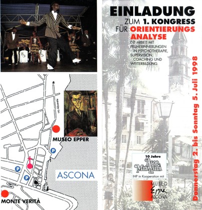 Während bei Rheinbraun nach Kohle gebuddelt wird, „buddeln“ die Lernenden in der John-Brinley-Akademie nach ihren persönlichen, kreativen Fähigkeiten für ihre Berufs- & Lebensgestaltung. Immerath stand in der Geschichte des IHP symbolisch für die Inhalte einer neuen Weiterbildung, wie sie bis auf den heutigen Tag mit großer Unterstützung der Landesregierung stattfindet. So wurde das Nazareth Kloster zu einem Geschenk des Himmels, wodurch die IHP Weiterbildung reibungslos fortgeführt werden konnte. 1998 fand in der Schweiz auf dem Monte Verità von Ascona parallel zur Festa New Orleans Jazz der 1. Kongress für OrientierungsAnalyse statt und zwar mit ausdrücklichem Bezug zu der zehnjährigen Kooperation des IHP mit dem Museo Epper seit 1988. Die Gestaltung der Kongress-Vorträge wurde von unseren Kollegen Dieter RAABE (Bioenergetik), Konrad HEILAND (Musiktherapie) in Kooperation mit Dagmar, René HARSCH (Museo), Diana MIROLO (Museo) und mir vorgenommen. Kongress begleitend fand in den Räumen des Monte Verità Hotels eine Ausstellung von jenen Bildern Ignaz & Mischa EPPERs statt, mit denen wir bis dahin im Kontext der Asco Mentalità Seminare gearbeitet hatten. Und immer wieder war Prof. Dr. Boris LUBAN-PLOZA (Balint Gesellschaft) unser ganz spezieller Gast,